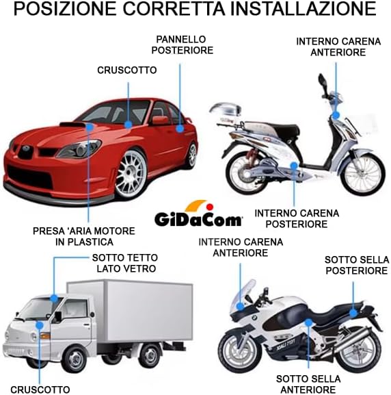 - [antifurto avanzato] progettato per moto, scooter, auto, camper e furgoni. Utilizza tecnologie GSM, GPS, GPRS, LBS e AGPS per localizzare il veicolo con precisione. Mentre il GPS fornisce una posizione accurata entro pochi metri, il dispositivo può anche utilizzare il sistema di localizzazione GSM (triangolazione delle celle) in ambienti dove il segnale GPS è debole o assente, come garage o parcheggi sotterranei, con una precisione approssimativa fino a 1 km, variabile in base alla distanza dai ripetitori.