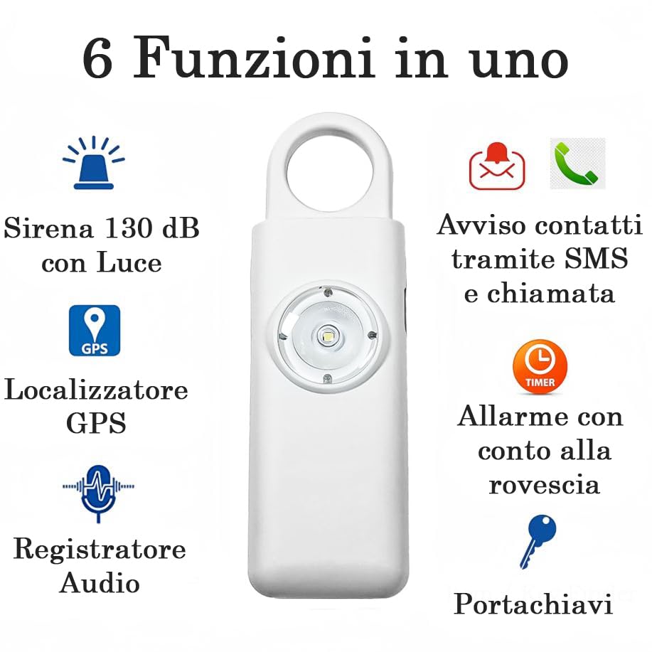 Portachiavi Allarme Antipanico, Dispositivo Antiaggressione SOS Chiamata Automatica, Invio Istantaneo Posizione GPS, Sirena 130dB, Difesa Personale e Autodifesa per Donne, Bambini e Anziani (Bianco)